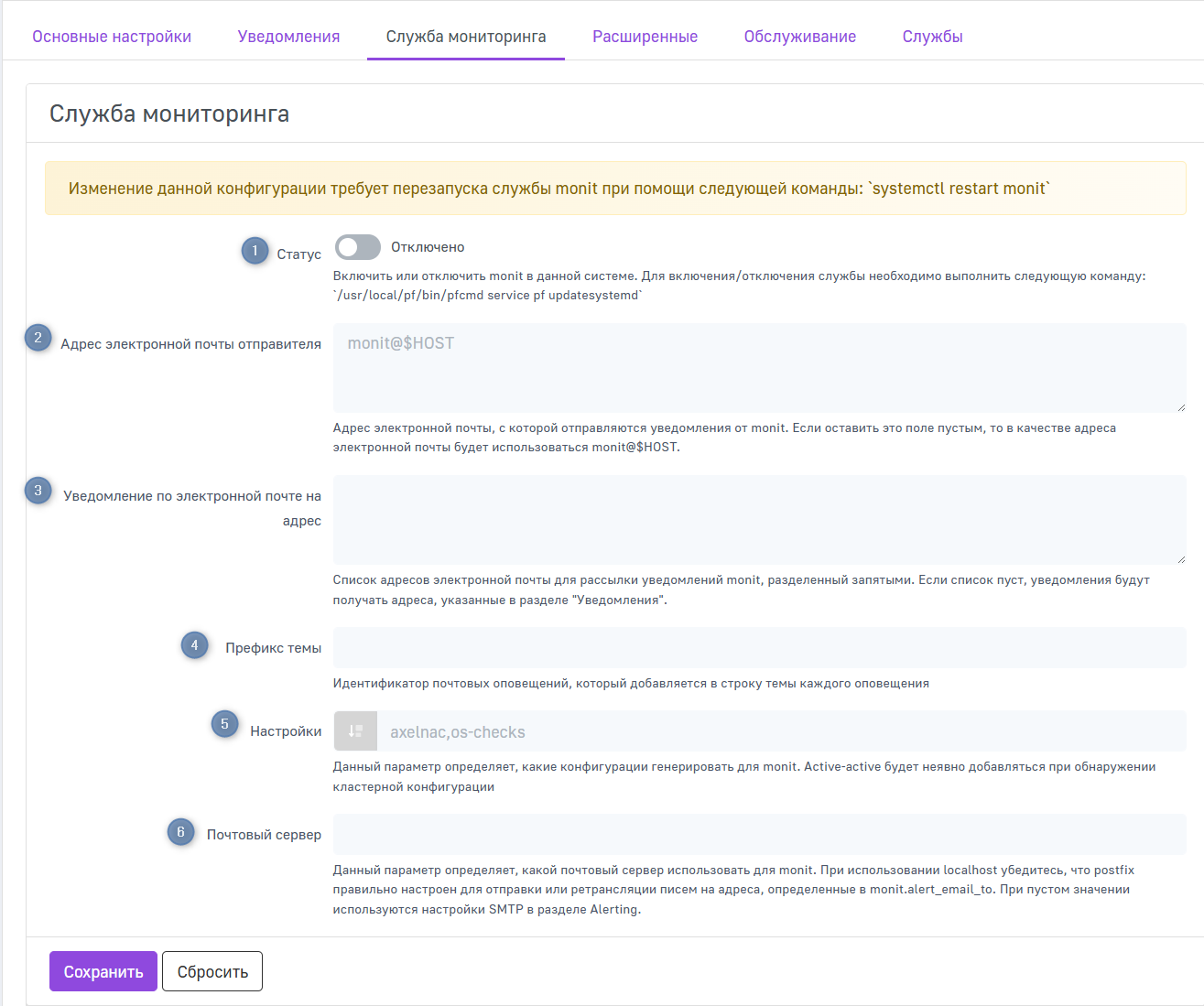 Вкладка Служба мониторинга предназначена для управления службой monit, используемой в AxelNAC для контроля состояния системных компонентов и отправки уведомлений при сбоях.