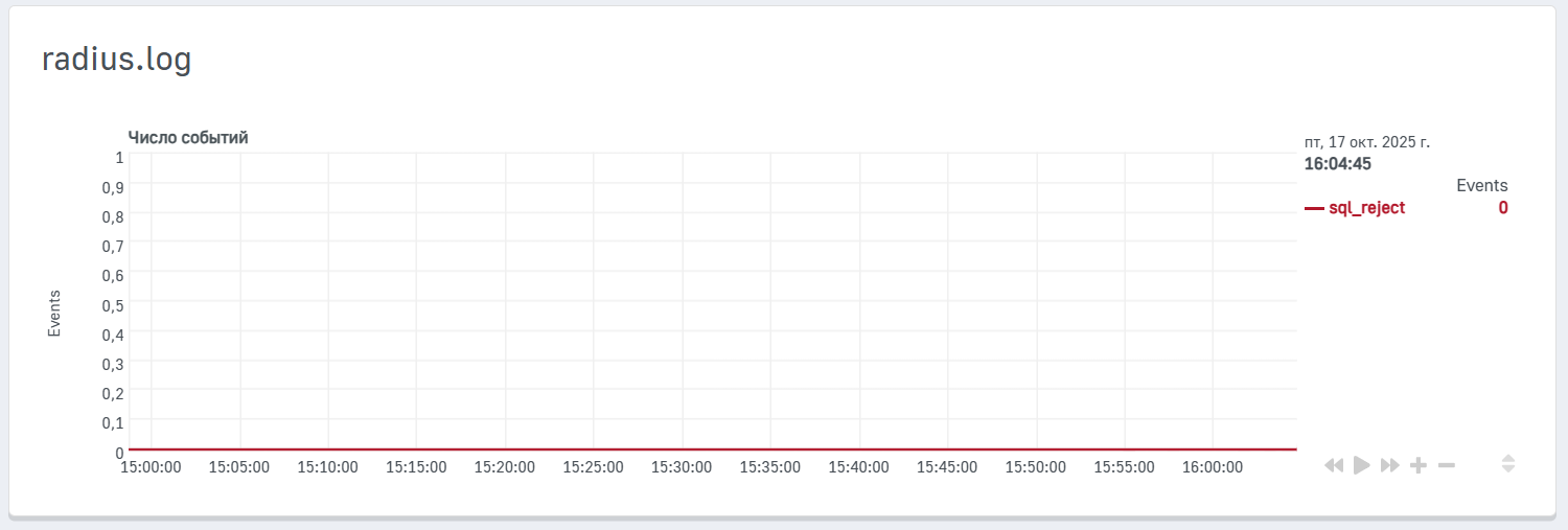 - sql_reject — количество запросов аутентификации, отклонённых сервером RADIUS и зафиксированных в SQL-журнале.