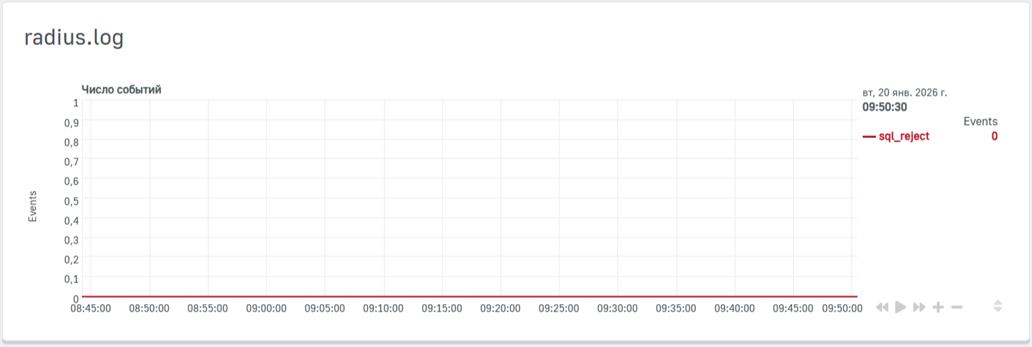 - sql_reject — количество запросов аутентификации, отклонённых сервером RADIUS и зафиксированных в SQL-журнале.