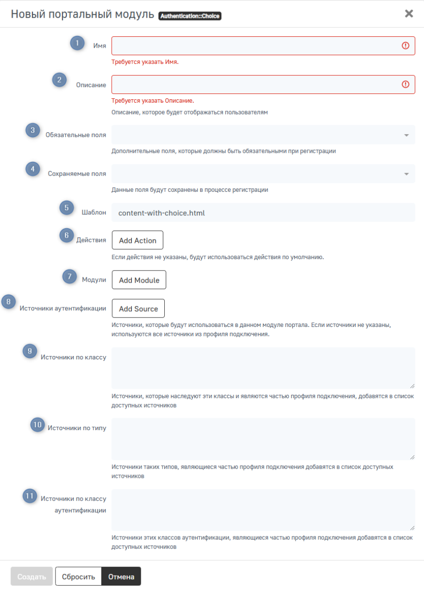 - Модули — модули портала, между которыми пользователю будет предложен выбор. Создаются на странице Расширенные настройки доступа → Модули портала;