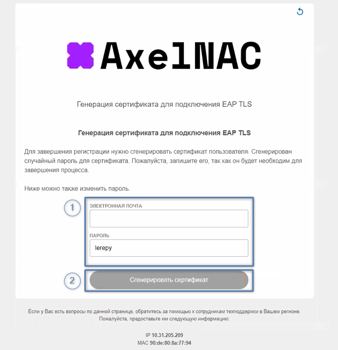 Теперь, при подключении к сети, пользователю будет предложено указать электронную почту и пароль, для которых будет сгенерирован сертификат. После указания учетных данных, появится ссылка для скачивания агента инициализации, который произведет конфигурацию конечного устройства для работы со сканером соответствия. Подключение к сети с помощью агента инициализацииВы можете скачать и использовать данную инструкцию для взаимодействия с вашими пользователями. В нашей сети используется механизм сканирования, который проверяет ваше устройство на соответствие требованиям и политикам ИБ. Для того, чтобы сканер мог авторизоваться на вашем устройстве, необходимо произвести первичную конфигурацию вашего АРМ. Первое подключение к сетиПри первом подключении к сети, вы будете перенаправлены на Captive-портал. Внимательно прочтите условия использования доступа к сети и примите их. Укажите свою электронную почту, которая будет использоваться для генерации сертификата. Пароль генерируется автоматически, но вы можете указать свой собственный. Нажмите Сгенерировать сертификат.