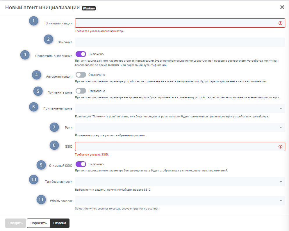 Для того чтобы создать новый агент инициализации, заполните параметры конфигурации и нажмите Создать. Чтобы сбросить введенные параметры на стандартные значения, нажмите Сбросить. Для возвращения на предыдущую страницу без сохранения выполненных на странице действий, нажмите Отменить.